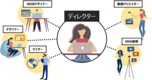 マーケター・デザイナー・広告運用者など、専門家が分担・連携して対応。