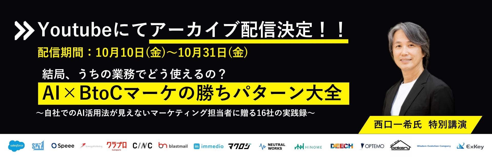 | セミナーテーマ | 結局、うちの業務でどう使えるの?AI×BtoCマーケの勝ちパターン大全 ~自社でのAI活用法が見えないマーケティング担当者に贈る16社の実践録~ |