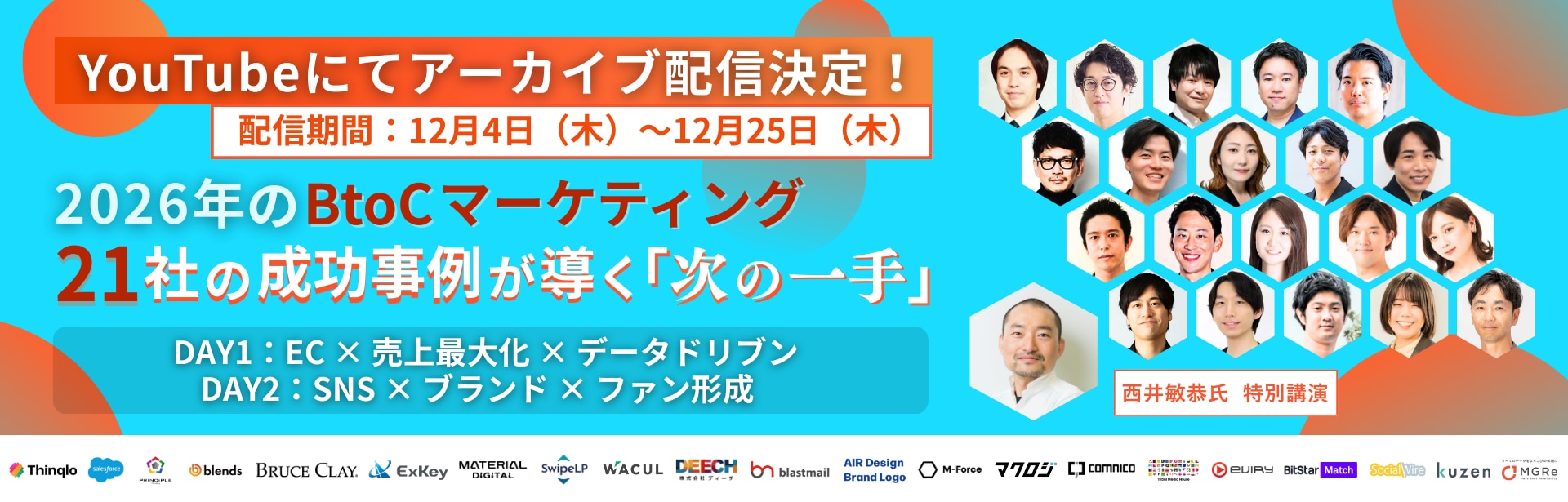 ・BtoC企業のマーケティング担当者、責任者 ・広告やSNS施策の費用対効果に伸び悩んでいる方 ・顧客データはあるが、活用できていない方 ・実際に成果を上げている企業のリアルな取り組み事例を知りたい方 ・来年に向けてマーケティング戦略や体制を見直したい方 ・短期的な成果だけでなく、ブランドの中長期的成長を実現したい方 |